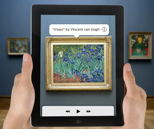 Augment existing visual content like wall labels with additional information on the screen. Our feature detects every piece in a gallery and provides a title and description for each artwork or object.